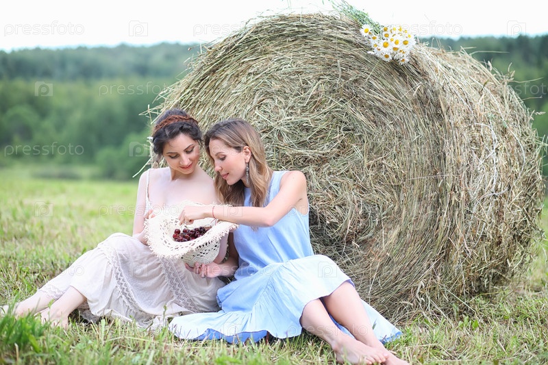 Две девушки в платьях на летнем поле