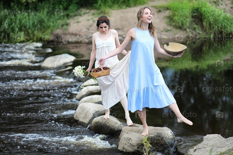 Красивые девушки в платьях на реке