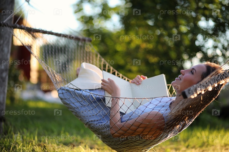 Красивая молодая девушка, лежащая и читающая книгу