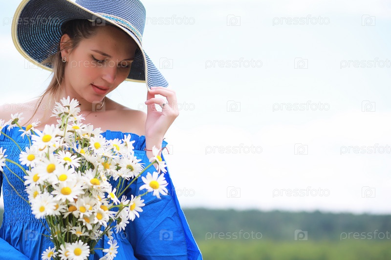 Молодая милая девушка в шляпе на поле при закате солнца