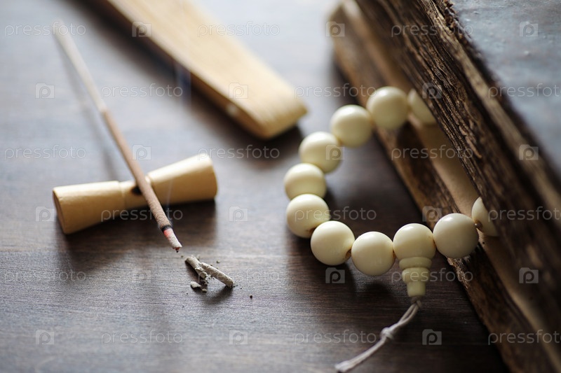 Бусы и ладан на деревянном столе