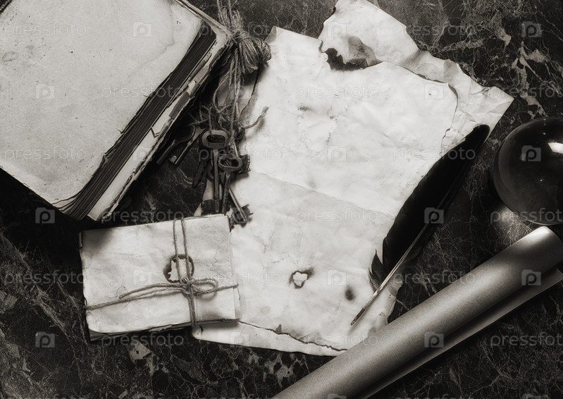 Старые ретро-бумаги и книга на столе с детективными инструментами backgro