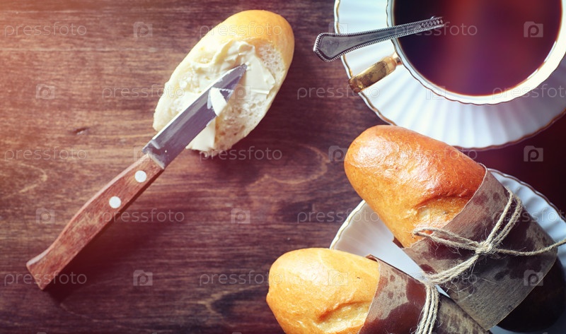 Свежие булочки на завтрак, бутерброд с маслом к чашке кофе в