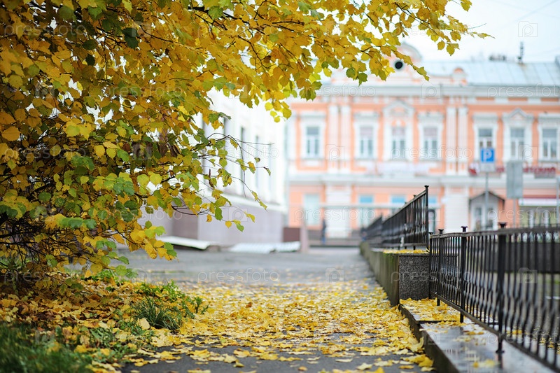Осенний пейзаж.Листья летают с деревьев в городе