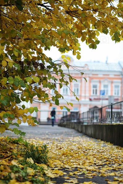 Осенний пейзаж.Листья летают с деревьев в городе