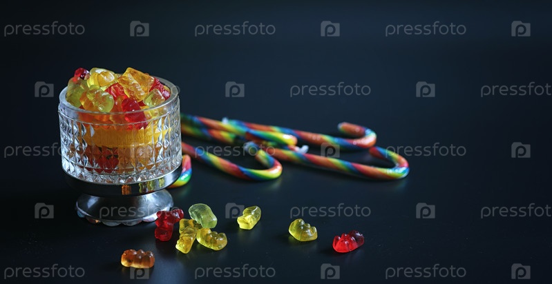 Мармелад в вазе на столе, сладости в миске на черном ба