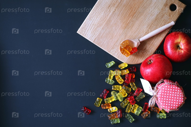Мармелад в вазе на столе, сладости в миске на черном ба