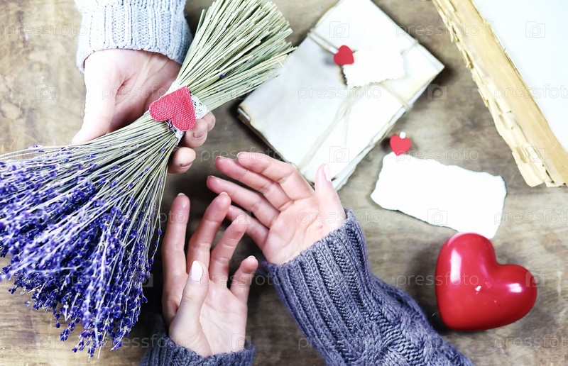 Девушка с букетом цветов лаванды на деревянном столе
