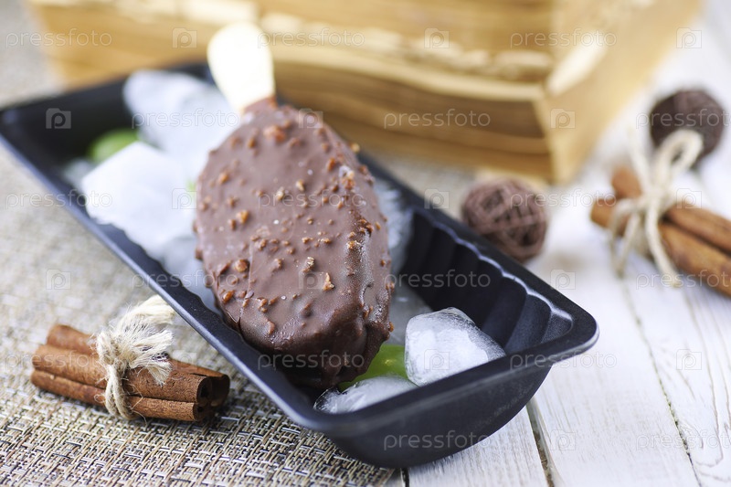 Десерт шоколадное мороженое с орехами на деревянной палочке