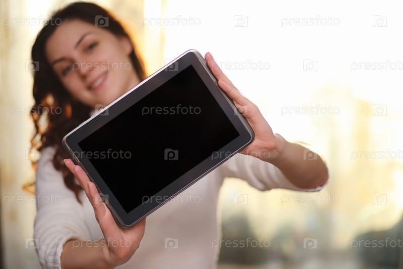 Девушка держит планшет, у нее есть компьютер со скриптом