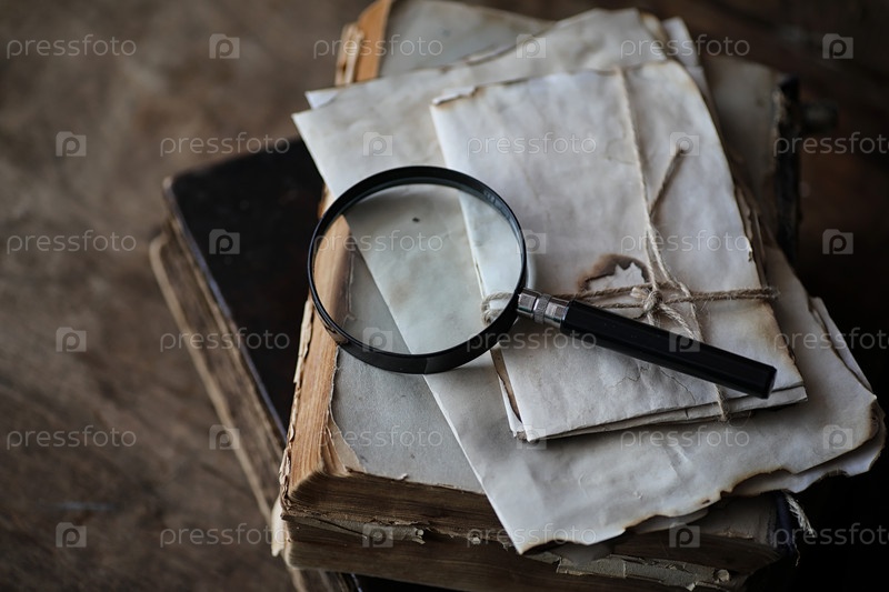 Старые книги на деревянном столе и увеличитель