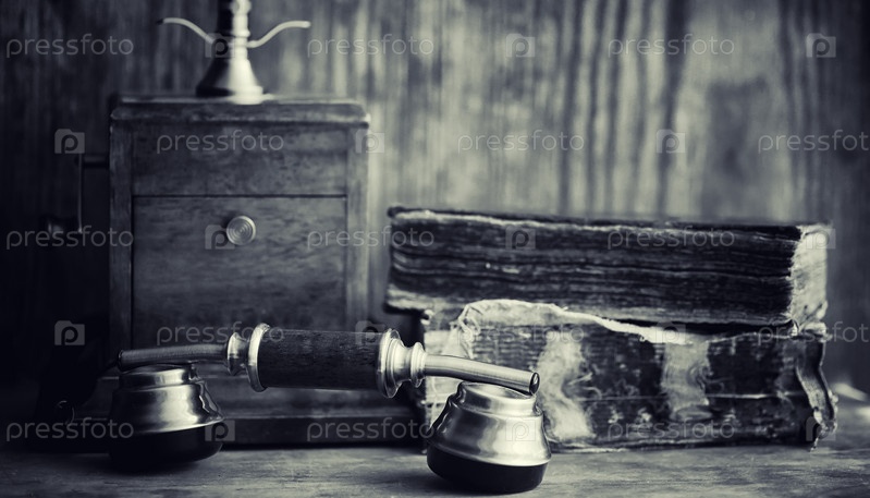 Старый телефон и ретро-книга на столе