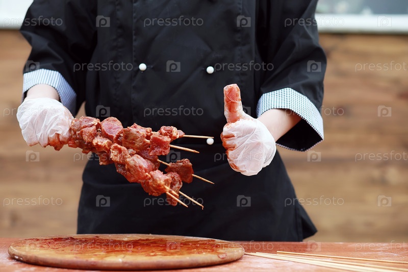 Повар разрезает мясо для приготовления барбекю