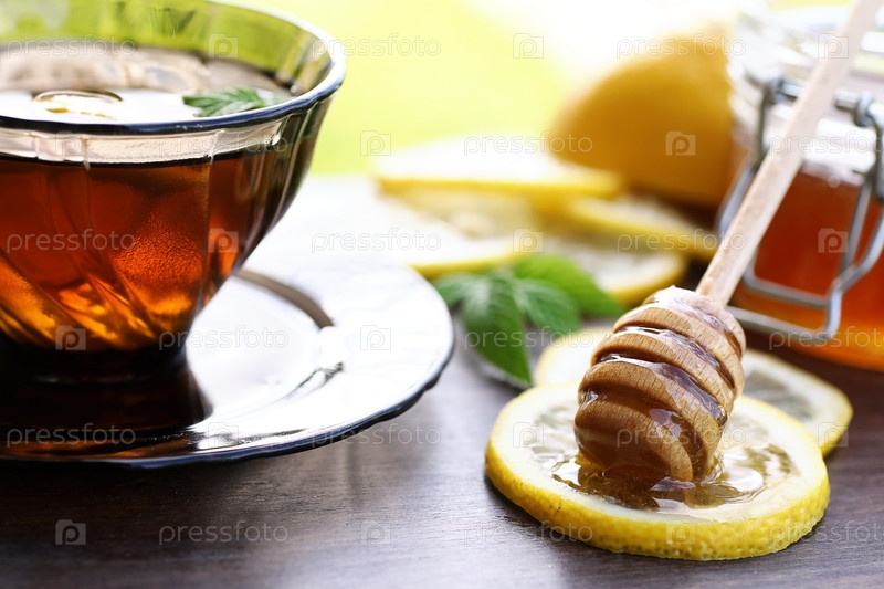 Свежий мед со стаканом черного чая