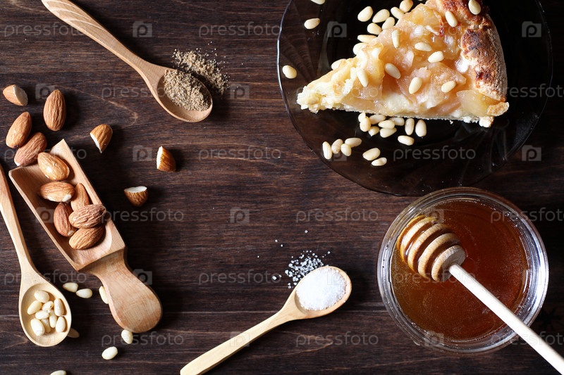 Свежие орехи на столе для завтрака с медом
