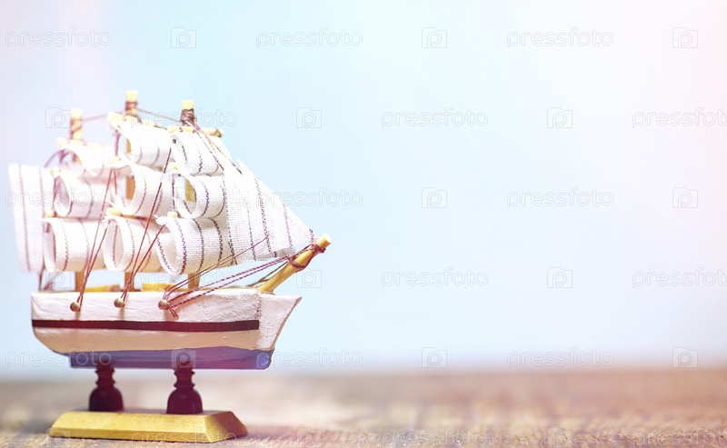 Старый деревянный корабль с парусами и мачтами, игрушка на стенде