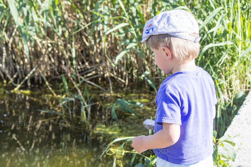 Маленький мальчик бросает в реку гальки