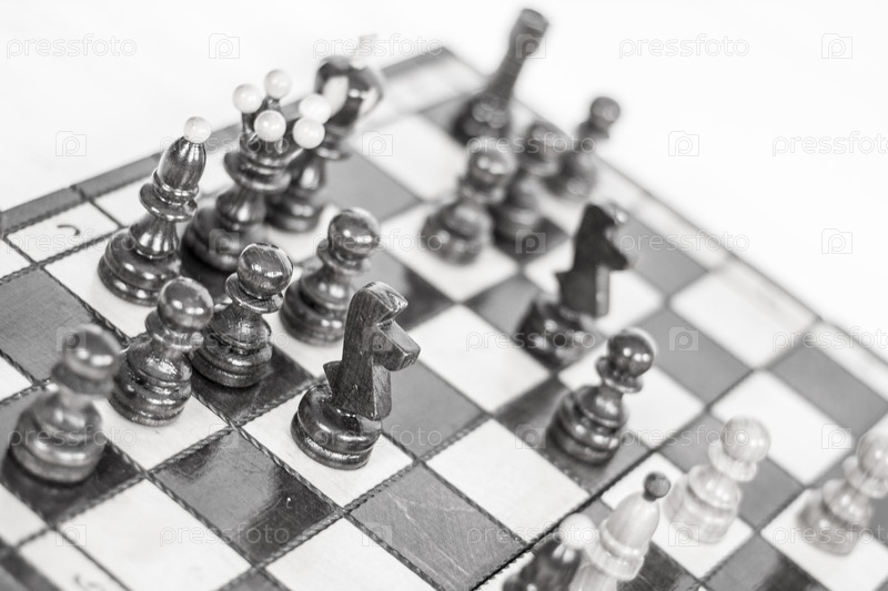 Шахматы.Шахматная доска.Деревянные шахматные фигуры. чёрно-белая фотография