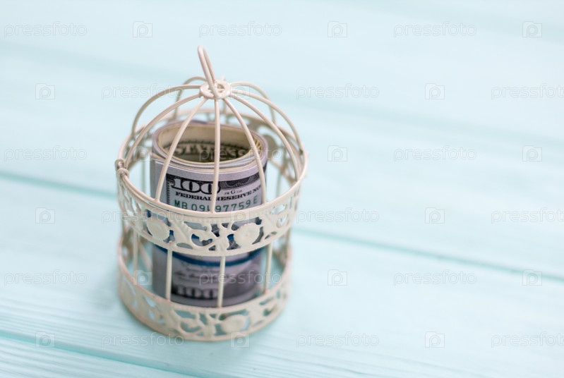 Доллары в железной клетке на деревянном фоне