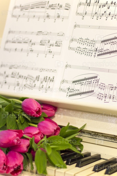 Розовые тюльпаны на белом фортепиано
