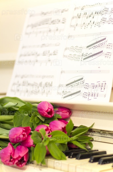 Розовые тюльпаны на белом фортепиано