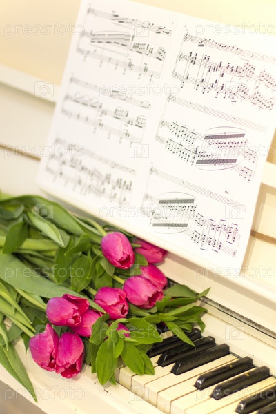 Розовые тюльпаны на белом фортепиано