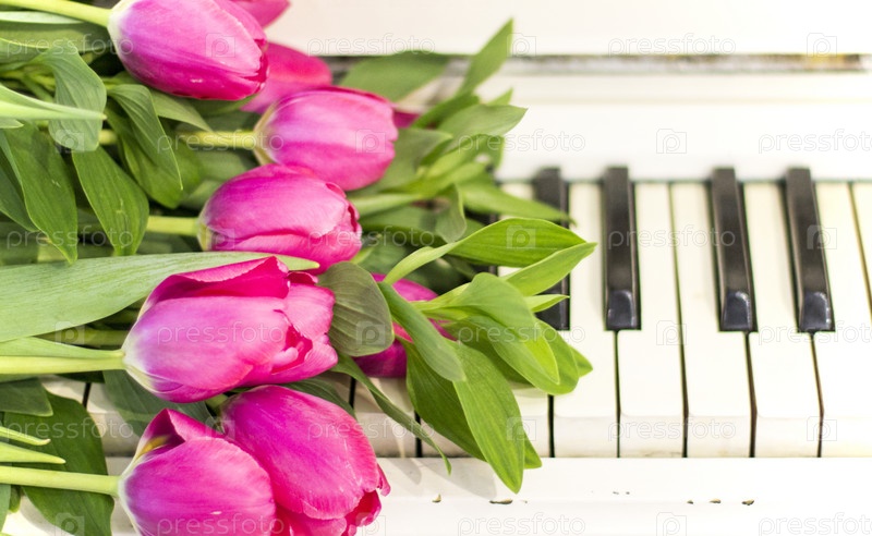 Розовые тюльпаны на белом фортепиано