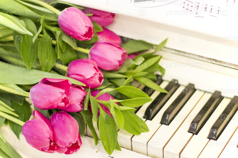 Розовые тюльпаны на белом фортепиано