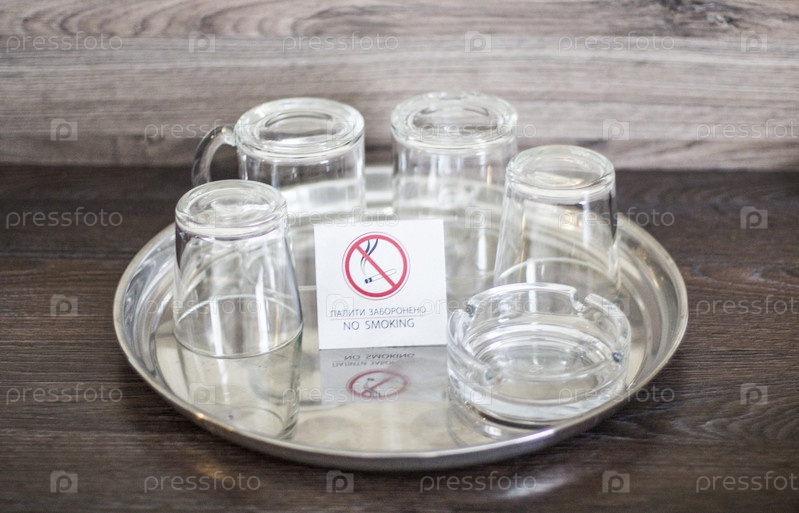 Стеклянные чашки с тарелкой Запрещено курить.Стекля в украинском отеле.Запрещается курение.Стекла на подносе