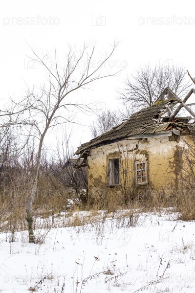 Старый глиняный дом в украинской деревне. разрушенный глиняный дом на снегу. разрушенный глиняный дом и высохшие деревья