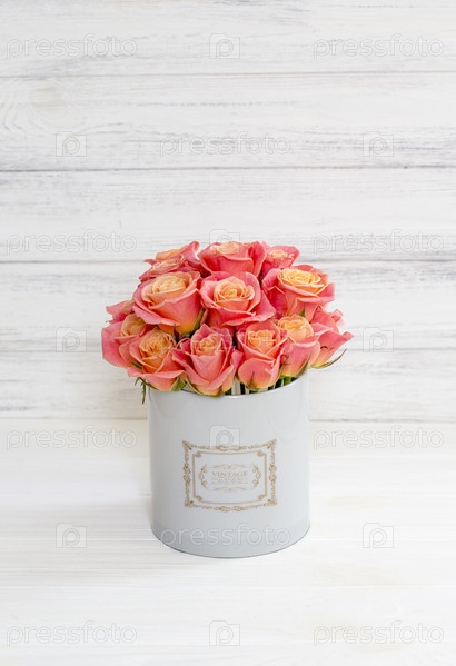Красивые розовые розы в круглом ящике. Персиковые розы в круглой коробке. Розы в круглой коробке на белом деревянном фоне. Розы в шкатулке с шляпами