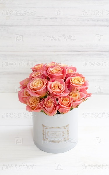 Красивые розовые розы в круглом ящике. Персиковые розы в круглой коробке. Розы в круглой коробке на белом деревянном фоне. Розы в шкатулке с шляпами