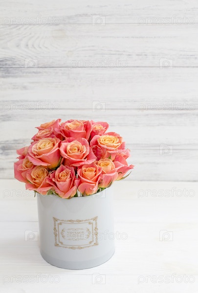 Красивые розовые розы в круглом ящике. Персиковые розы в круглой коробке. Розы в круглой коробке на белом деревянном фоне. Розы в шкатулке с шляпами