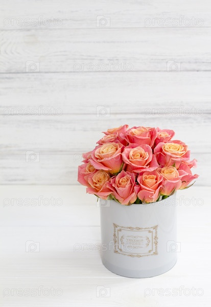 Красивые розовые розы в круглом ящике. Персиковые розы в круглой коробке. Розы в круглой коробке на белом деревянном фоне. Розы в шкатулке с шляпами