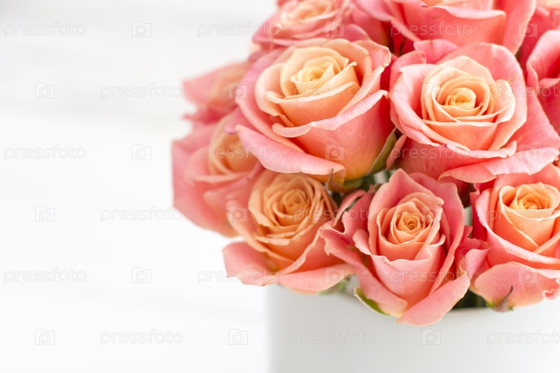 Красивые розовые розы в круглом ящике. Персиковые розы в круглой коробке. Розы в круглой коробке на белом деревянном фоне. Розы в шкатулке с шляпами