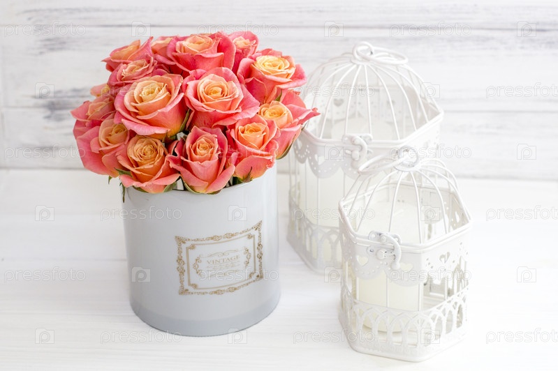 Красивые розовые розы в круглом ящике. Персиковые розы в круглой коробке. Розы в круглой коробке на белом деревянном фоне. Розы в шкатулке с шляпами