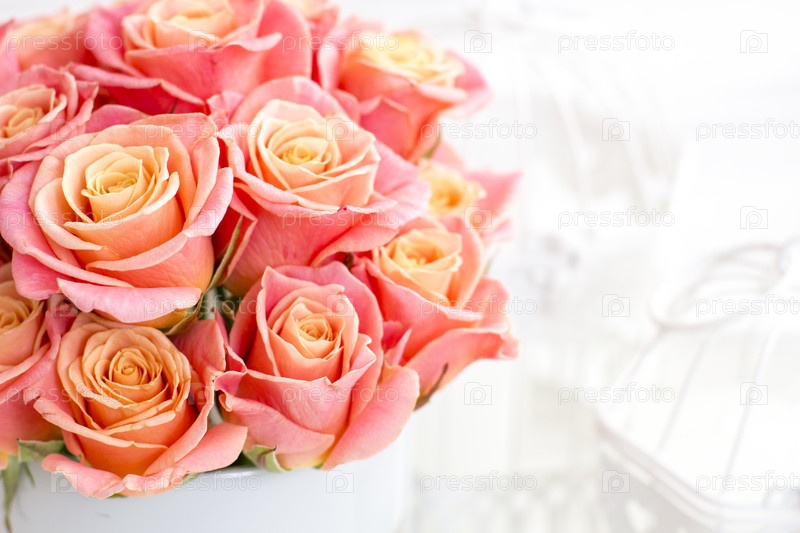 Красивые розовые розы в круглом ящике. Персиковые розы в круглой коробке. Розы в круглой коробке на белом деревянном фоне. Розы в шкатулке с шляпами