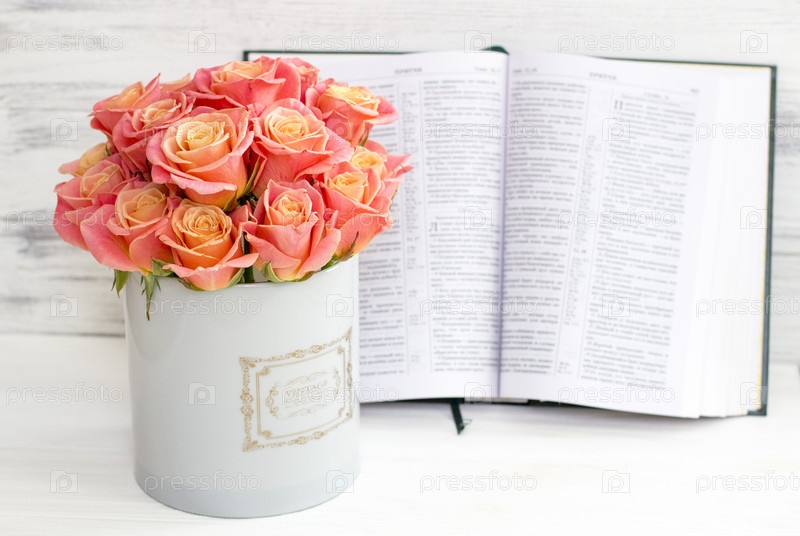 Розы в круглой коробке и Библия Красивые розовые розы на белом деревянном фоне Красивые розовые розы и Библия