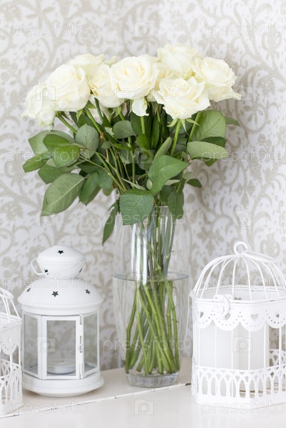 Букет белых роз в вазе.Белые розы и декоративные клетки