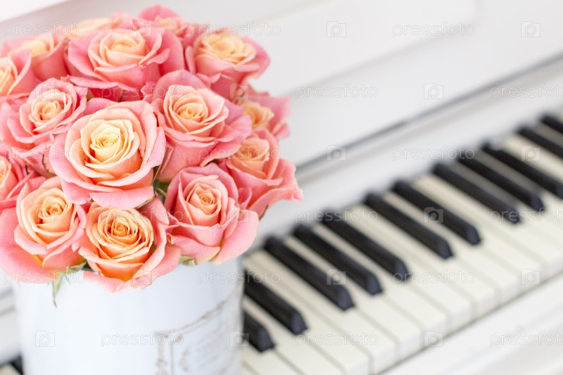 Красивые розовые розы в круглой коробке на пианино