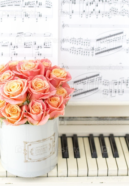 Красивые розовые розы в круглой коробке на пианино