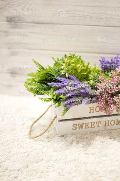 Цветы в белой деревянной коробке. внутреннее оформление, композиция интерьера. цветы и ветви в деревянной коробке на белом деревянном фоне