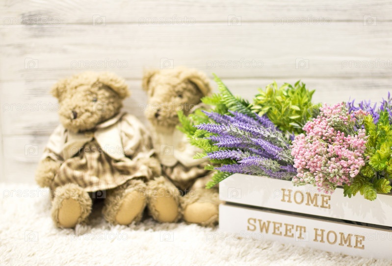 Цветы в деревянной коробке и милые медведи. цветки в белой деревянной коробке, плюшевые винтажные медведи. романтический подарок, фон для поздравлений