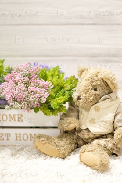 Цветы в деревянной коробке и милые медведи. цветки в белой деревянной коробке, плюшевые винтажные медведи. романтический подарок, фон для поздравлений