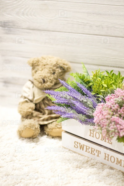 Цветы в деревянной коробке и милые медведи. цветки в белой деревянной коробке, плюшевые винтажные медведи. романтический подарок, фон для поздравлений