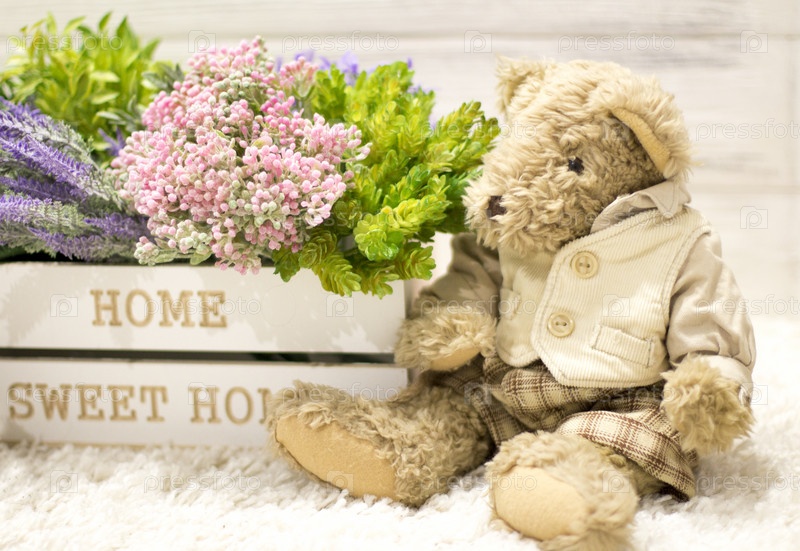 Цветы в деревянной коробке и милые медведи. цветки в белой деревянной коробке, плюшевые винтажные медведи. романтический подарок, фон для поздравлений
