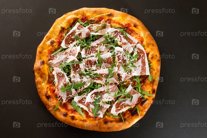 Итальянская пицца с беконом и салатом руккола на черном фоне