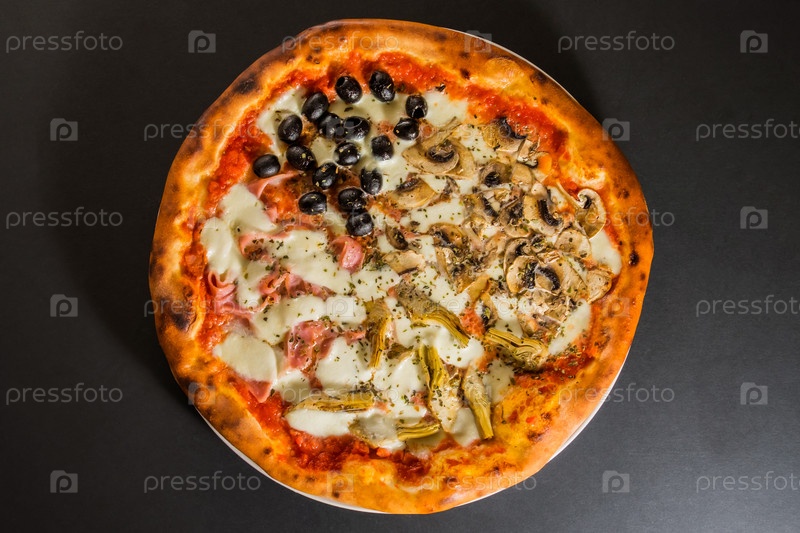 Пицца с артишоками и грибами шампиньонами на черном фоне
