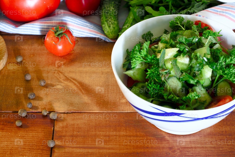 Вкусный овощной салат с огурцом, помидором и петрушкой на деревянном кухонном столе
