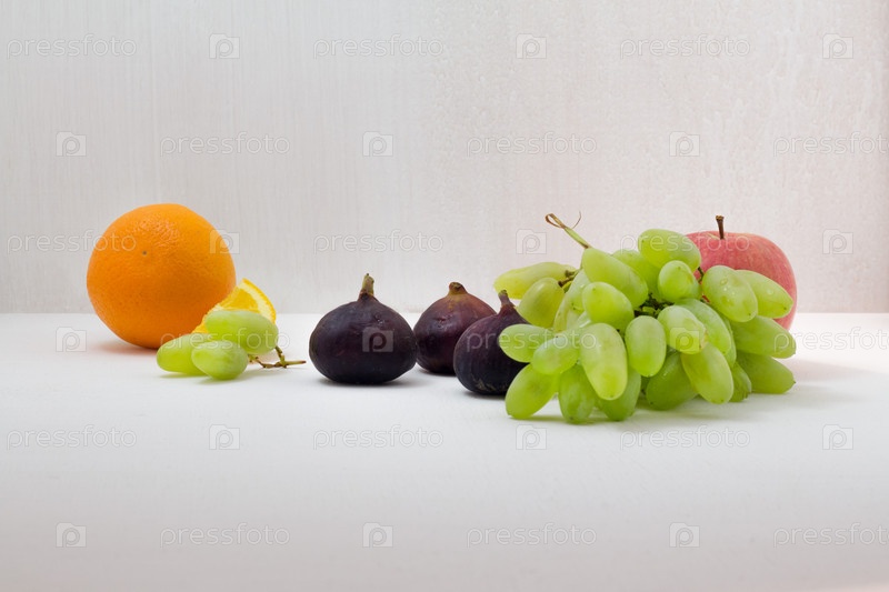 Зрелый виноград, инжир, апельсин на белом деревянном столе